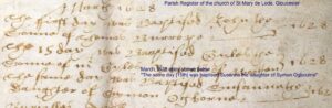 The registers for for St Mary de Lode parish actually commence from 1675, and the Bishop’s transcripts have therefore been searched for the above entries. 1619, half of 1621, 1627, and 1630 – 1636 are missing.