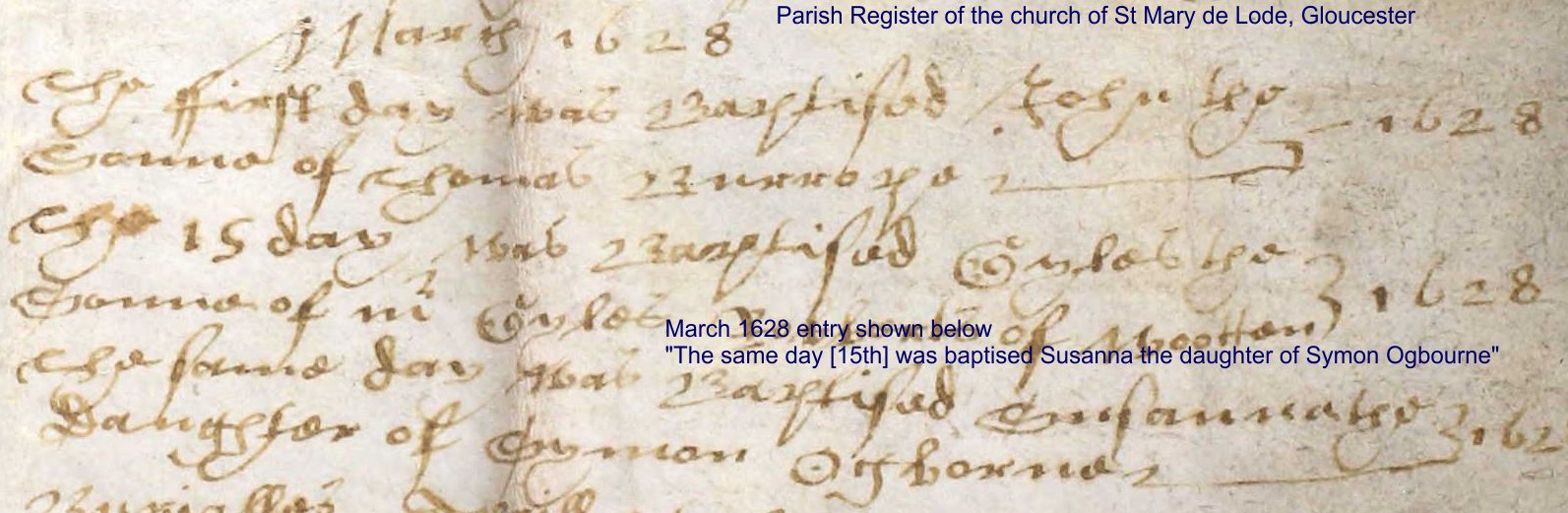 - Two daughters were born to a Symon Ogborne and christened, and one buried in the Gloucester City church of St Mary Lode in the 1620s: