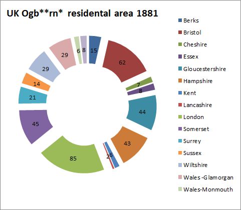 The charts below show the distribution of people with variations in the name of Ogb**rn* taken from UK cencus records. The record shows that at that time the majority of Ogb**rn*s lived in the south of England and Wales. In the 1881 cencus there were 424 people with variations of the name.